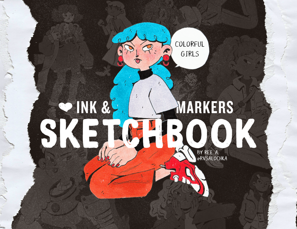 A sketchbook filled with ink and (copic) markers illustrations, with some color pencil for texturing or sketching. You'll find a lot of bold color palettes, female character design, fantasy and fashion inspiration. These are mostly completed illustration, so more than just sketches!